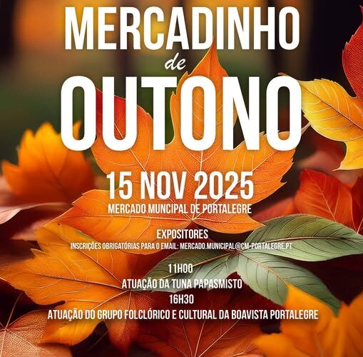 “Mercadinho de Outono”, dia 15 de novembro, das 10h00 às 18h00, no Mercado Municipal de Portalegre. Inscrições obrigatórias para os expositores, através do email mercado.municipal@cm-portalegre.pt. Uma organização do Município de Portalegre.