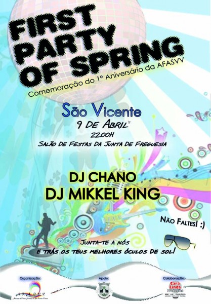 A “First Party of Spring” chega à Freguesia elvense de São Vicente e Ventosa no dia 9 de Abril de 2011 pelas 22.00h no Salão de Festas da Junta de Freguesia, com o objectivo de dar as boas-vindas à primavera e principalmente comemorar o 1º Aniversário da AFASVV – Associação de Festas e Animação de São Vicente e Ventosa, a qual foi fundada a 7 de Abril de 2010.