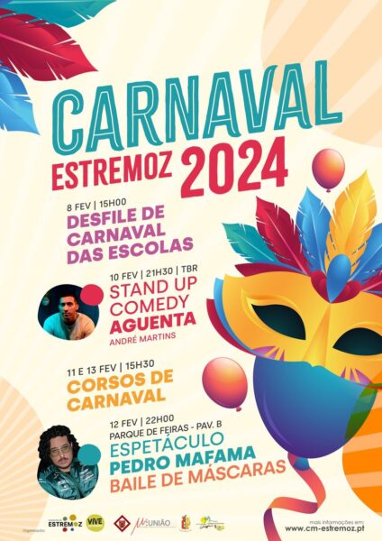 Nos dias 11 e 13 de fevereiro, no centro da cidade de Estremoz, pelas 15h30, realizar-se-ão os habituais e animados Corsos de Carnaval! Estão ainda a ser aceites inscrições de grupos, com o mínimo de 12 elementos, através do email cultura@cm-estremoz.pt.
