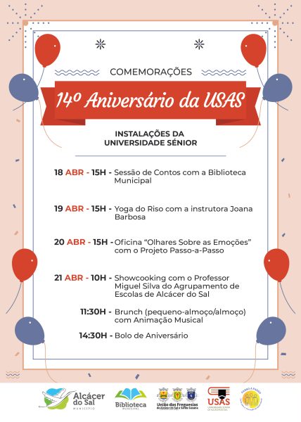 Na próxima semana de 18 a 21 de abril de 2023, a Universidade Sénior de Alcácer do Sal festeja o seu 14º Aniversário com atividades diárias para alunos e professores, a decorrer nas suas instalações. As atividades preparadas para o público interno que tanto tem contribuído para o crescimento da USAS, visam marcar estes 14 anos com momentos de partilha entre todos.
