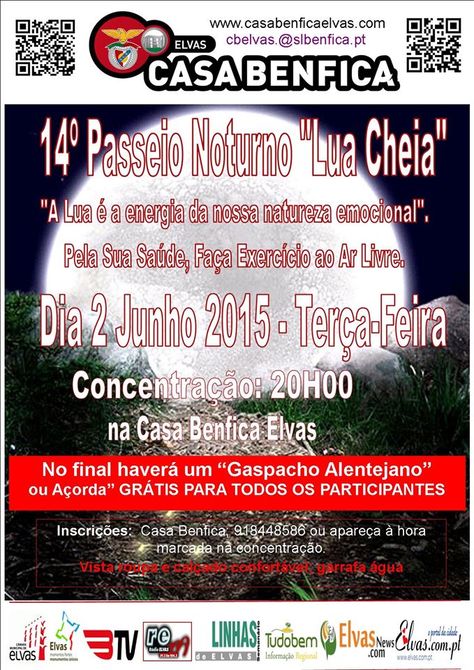 Dia 2 de junho, terça-feira, pelas 20h00, realiza-se o 14º Passeio Noturno “Lua Cheia” organizado pela Casa do Benfica de Elvas. As inscrições são gratuitas e podem ser feitas através do e-mail cbelvas.@slbenfica.pt, ou na Casa do Benfica. É aconselhável levar roupa e calçado desportivo e água.