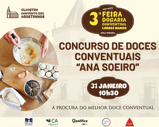 Nos próximos dias 30, 31 de Janeiro e 1 de Fevereiro, Vila Viçosa recebe a 3.ª Feira de Doçaria Conventual de Vila Viçosa! Para além dos expositores que marcarão presença no Convento dos Agostinhos, terá também lugar o Concurso de Doces Conventuais, que decorrerá no sábado, dia 31 de janeiro, pelas 10h30, no referido local.