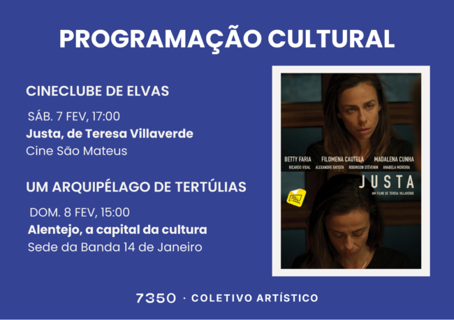 A 7350 apresenta a sua programação para o início de fevereiro, num fim de semana que volta a cruzar a arte cinematográfica com a reflexão política e estratégica sobre o futuro cultural da região. Nos dias 7 e 8 de fevereiro, a cidade de Elvas acolhe: