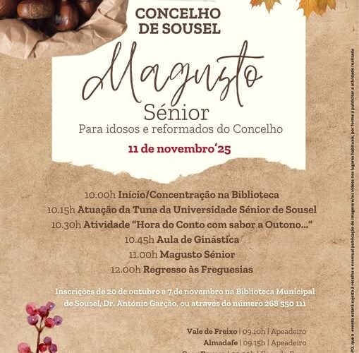 Magusto Sénior Castanhas, água pé e muitas atividades 11 de novembro | 10h00 Biblioteca Municipal Dr. António Garção, em Sousel Inscrições até 7 de novembro