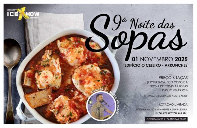 A Associação Freestyle Iceshow Arronches volta a promover um dos eventos gastronómicos mais apreciados do concelho: a 9.ª Noite das Sopas de Arronches, que se realiza no próximo dia 1 de novembro (sábado), a partir das 19h00, no espaço “O Celeiro”, em Arronches.