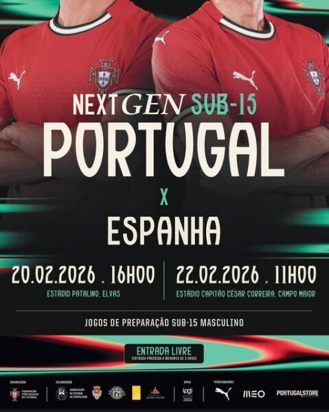 A cidade de Elvas recebe esta sexta-feira, 20 de fevereiro, pelas 16h00, no Estádio Domingos Patalino, o jogo internacional de futebol entre Portugal e Espanha, no escalão Sub-15 masculino. O encontro traz ao concelho duas seleções de referência e jovens atletas que poderão vir a representar as principais equipas profissionais e a própria Seleção Nacional.