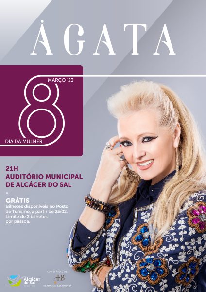 A conceituada cantora portuguesa Ágata é a proposta do Município de Alcácer do Sal para uma atuação no Auditório Municipal da cidade no Dia da Mulher, 8 de março de 2023 (quarta-feira), pelas 21 horas. A entrada é gratuita, devendo os bilhetes ser levantados no Posto de Turismo de Alcácer do Sal a partir do dia 25 de fevereiro (sábado), e havendo um limite de dois bilhetes por pessoa. O concerto de Ágata conta com o apoio da Herdade da Barrosinha.