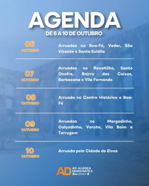 No âmbito das eleições autárquicas do próximo dia 12 de outubro, envio-vos uma leitura daquilo que foi a primeira semana de campanha eleitoral da coligação AD – ALIANÇA DEMOCRÁTICA, para vosso conhecimento e de toda a população.