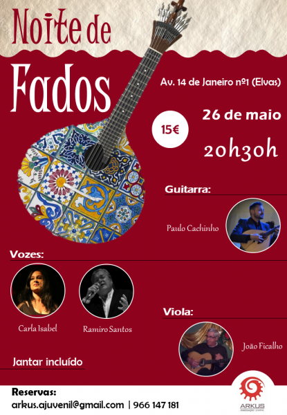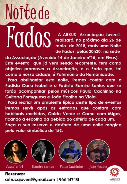 A ARKUS – Associação Juvenil irá realizar na sua sede mais uma Noite de Fados, no dia 26 de maio, pelas 20h30.