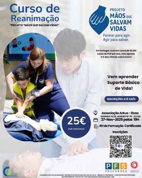 “A ARKUS, Associação Juvenil, em parceria com a PREFORSEG, disponibiliza a todos os interessados uma formação de Suporte Básico de Vida. O projeto “Mãos que salvam vidas” tem como objetivo através desta formação capacitar os formandos a dar uma resposta rápida numa situação emergente. A reanimação é um procedimento de emergência fundamental para aumentar as chances de sobrevivência do paciente. É aberta a toda a comunidade, principalmente, para as entidades que colaboram com crianças, adultos e seniores, diariamente.