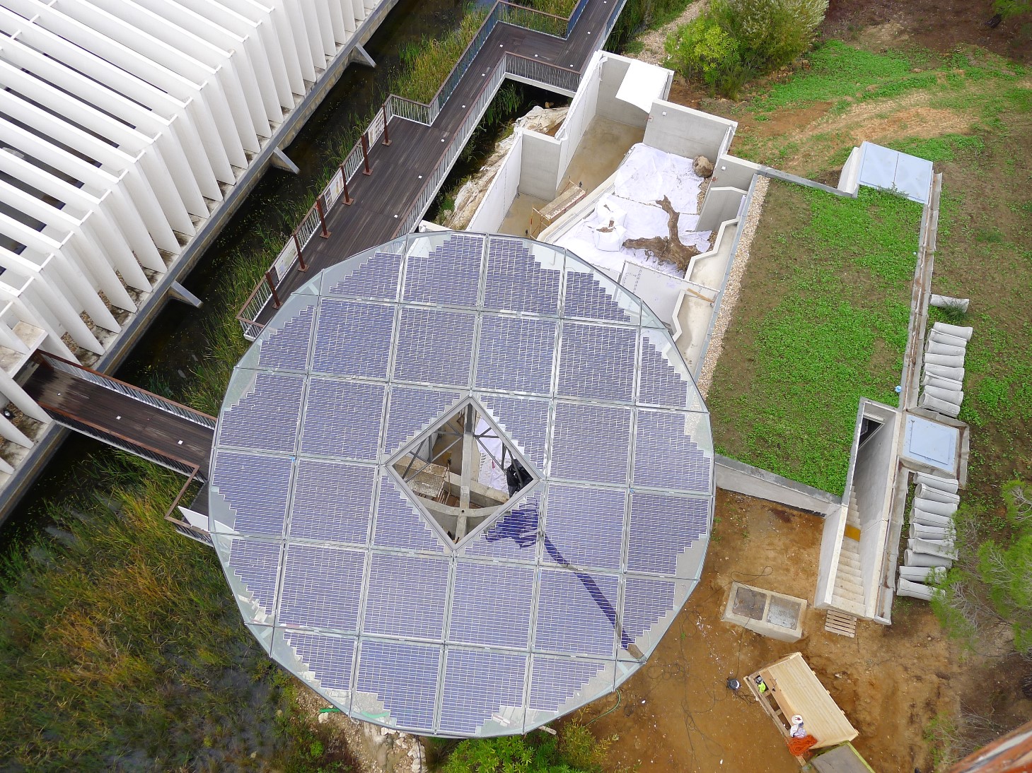 A árvore solar fotovoltaica do Fluviário de Mora foi concebida como um objecto arquitectónico inovador em que de um tronco, de betão, nascem os ramos que são sintetizados num disco que acolhe os painéis fotovoltaicos numa clara alusão às folhas da árvore.