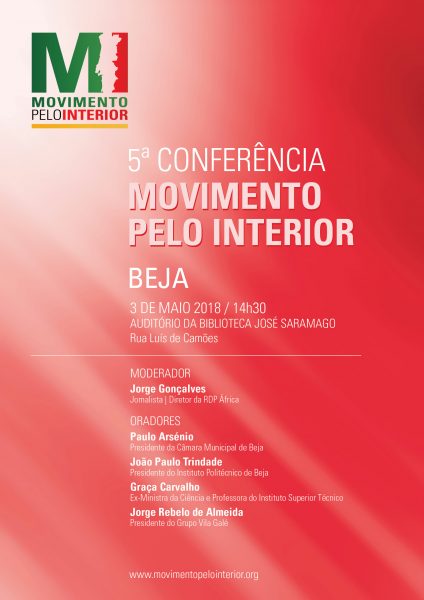 Beja acolhe hoje, dia 3 de maio, pelas 14h30, no auditório da Biblioteca Municipal de Beja, a quinta e última conferência organizada pelo Movimento pelo Interior, depois de já ter passado por Portalegre, Mação, Bragança e Covilhã.
