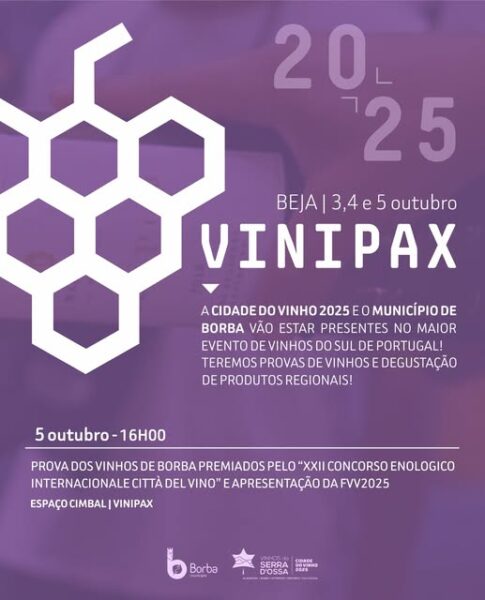 Nos próximos dias 3, 4 e 5 de outubro, BORBA marca presença VINIPAX 2025, em BEJA, representando a “Cidade do Vinho 2025”, a convite da Câmara Municipal de Beja.