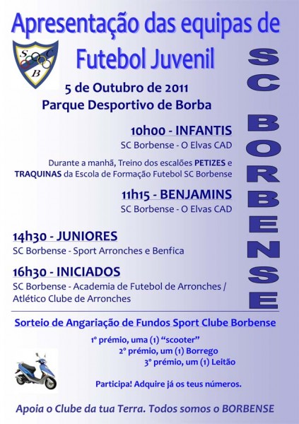 O Sport Clube Borbense vai realizar, ao longo do próximo dia 5 de Outubro (4ª feira, feriado), a apresentação das diferentes equipas de Futebol Juvenil que vão representar este clube na época 2011/2012.