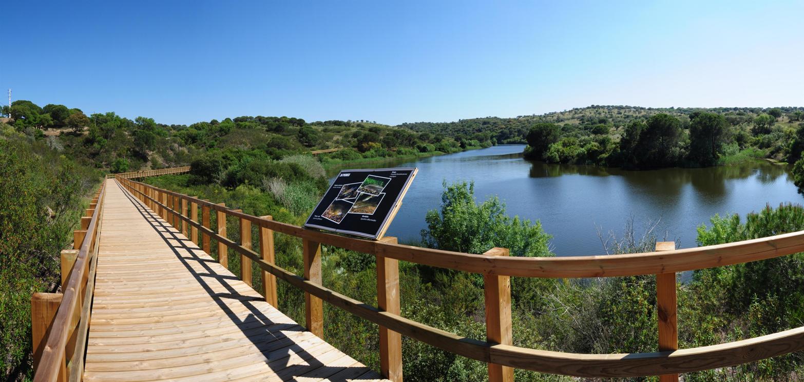 Mais à frente, o passadiço em madeira é substituído por caminhos de terra batida numa extensão de cinco quilómetros, avançando entre montados até regressar ao Fluviário.