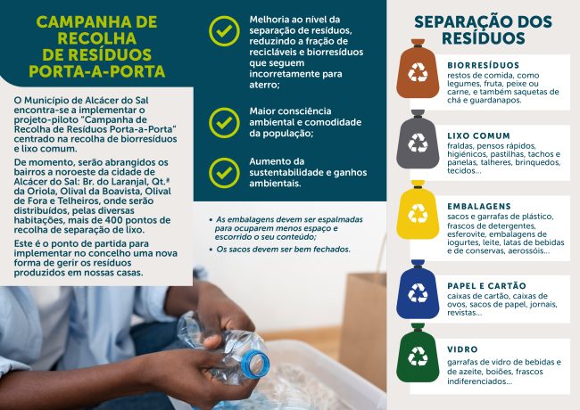 O Município de Alcácer do Sal encontra-se a implementar o projeto-piloto “Campanha de Recolha de Resíduos Porta-a-Porta”, centrado na recolha de biorresíduos e lixo comum. Os objetivos deste projeto, cujo mote é “CONCELHO LIMPO, DEVER DE TODOS”, são: