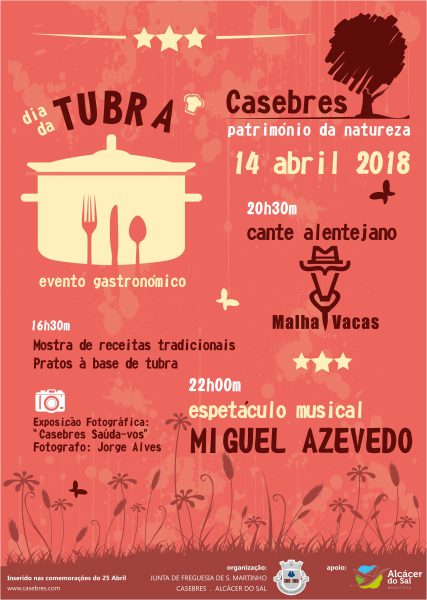 Sábado, 14 de abril é “Dia da Tubra” em Casebres, um evento gastronómico promovido pela Junta de Freguesia de S. Martinho com o apoio da Câmara Municipal de Alcácer do Sal.