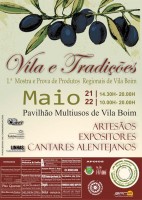“Vila e Tradições” é o tema da 1ª Mostra e Prova de Produtos Regionais de Vila Boim a realizar-se nos dias 21 e 22 de Maio no Pavilhão Multiusos, daquela aldeia. A organização do evento é das formandas Marina Arrifes e Pilar Romero do Curso Técnico de Organização de Eventos do Pólo de Elvas da Escola Profissional da Região Alentejo de Elvas em parceria com a Junta de Freguesia de Vila Boim. Este acontecimento é parte prática da Prova de Aptidão Profissional de final de curso das formandas.