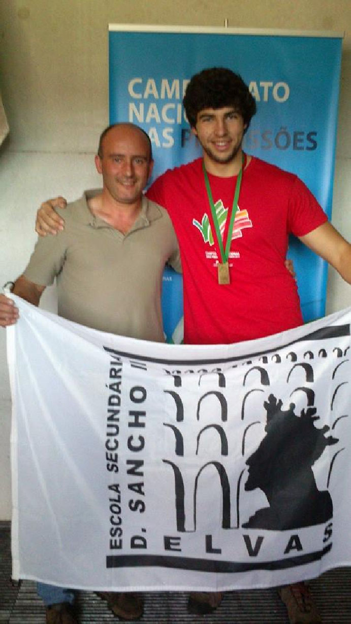 Por esta razão, foi-lhe atribuída a medalha de bronze, que exibe na imagem, acompanhado pelo professor Nuno Ramalho, responsável pela sua preparação e que fez parte da equipa de jurados da profissão de Electricidade de Instalações.