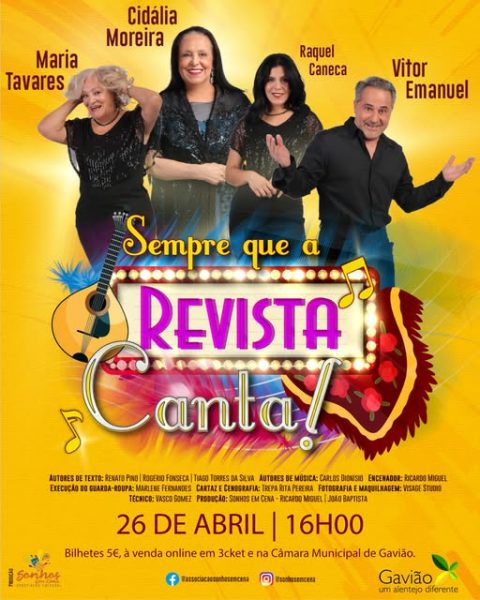 Cidália Moreira, Vítor Emanuel e Maria Tavares são três dos maiores nomes do panorama artístico portugueses e, ao lado da atriz Raquel Caneca, juntam-se, agora, no espetáculo musical e revisteiro SEMPRE QUE A REVISTA CANTA!