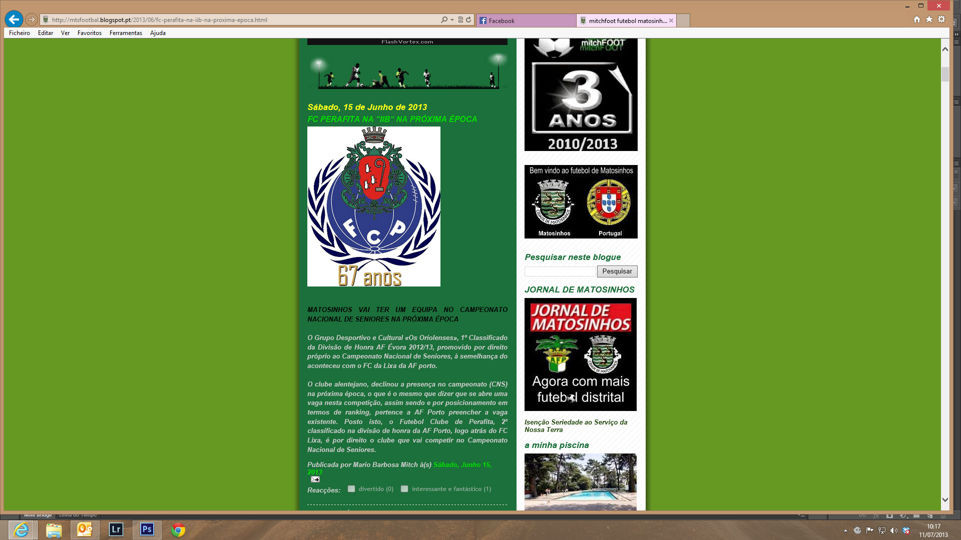 6 – Facto: No dia 15 de junho foi publicada uma notícia (link: http://mtsfootbal.blogspot.pt/2013/06/fc-perafita-na-iib-na-proxima-epoca.html) que afirmava que um clube da Associação de Futebol do Porto ia ocupar a vaga da Associação de Futebol de Évora e nessa mesma notícia foi exposta uma troca de e-mails no dia 19 de abril (conforme se pode ler num comentário à mesma notícia) com a Federação Portuguesa de Futebol sobre a possibilidade de algum clube não poder participar no Campeonato Nacional de Seniores. É estranho mas compreende-se esta notícia e a troca de e-mails com a Federação Portuguesa de Futebol por quem já tinha interesse em beneficiar do Regulamento do Campeonato Nacional de Seniores que prevê na alínea 5 do artigo 25º o seguinte: “No caso de um ou mais Clubes que tenham garantido desportivamente a possibilidade de disputar o Campeonato Nacional de Seniores não reunirem os requisitos regulamentares de inscrição nesta Prova, os seus lugares são preenchidos pelos representantes das Associações Distritais, com maior número de Clubes a disputarem provas oficiais de Seniores em futebol 11 masculino”;