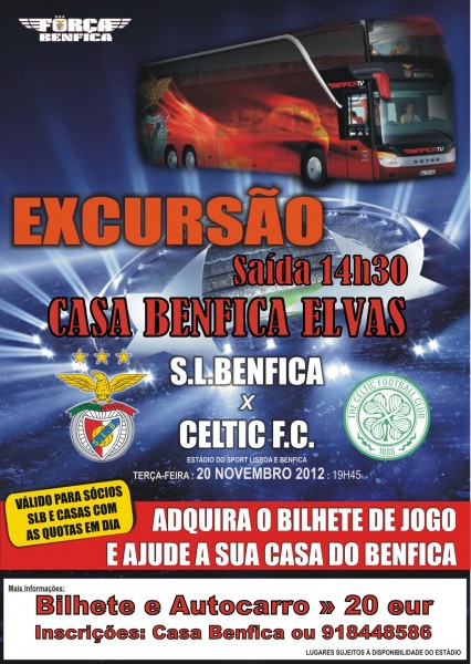 A Casa do Benfica em Elvas, vai realizar dia 20 de Novembro, uma excursão para o jogo Benfica – Celtic