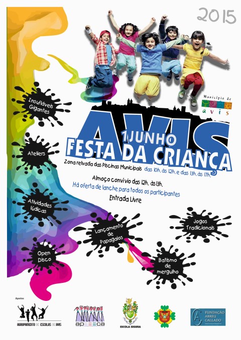 Neste dia tão especial, celebremos as crianças com a oferta de um conjunto de ateliers de artes, de expressões, de pintura, de movimento, de dança e de moda, isto sem contar com um alargado leque de brincadeiras, divertimentos, ação e muito convívio, ingredientes absolutamente necessários para a participação no karaoke e no open disco, nos jogos tradicionais, nos insufláveis gigantes espalhados pelo recinto, nas gincanas, nos concursos e no batismo de mergulho, nas Piscinas Municipais. E, como não podia deixar de ser, o almoço que terá lugar no local, ao ar livre, vai ser oferecido pela Câmara Municipal de Avis às 300 crianças do Agrupamento de Escolas de Avis e da Creche da Santa Casa da Misericórdia de Avis, bem como a todos os frequentadores das Ludotecas Municipais, A meio da tarde, os lanches distribuídos a todas as crianças serão oferecidos pela APEEECA.
