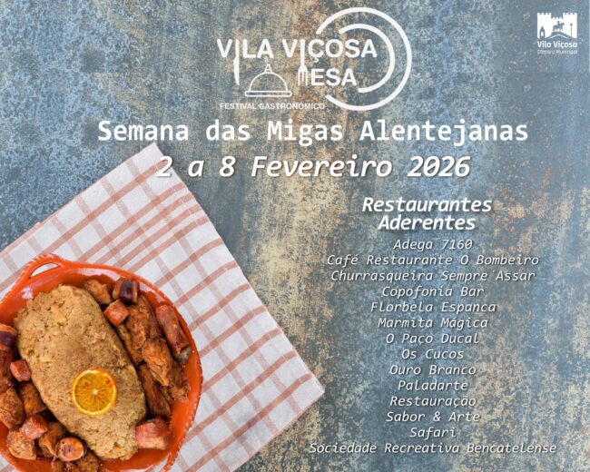 O Município de Vila Viçosa informa que decorre, do dia 2 de fevereiro até dia 8 de fevereiro de 2026, a Semana Gastronómica das Migas Alentejanas, as quais são uma das muitas iguarias emblemáticas da cozinha tradicional alentejana.