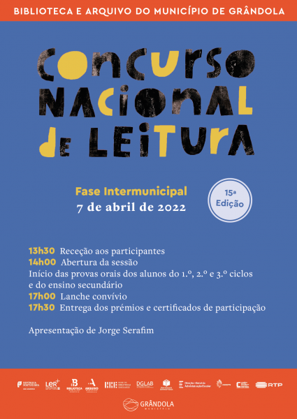 Este ano, o Município de Grândola com o apoio da Direção-Geral do Livro, Arquivos e Bibliotecas e da Rede de Bibliotecas Escolares, organiza a fase intermunicipal do Concurso Nacional de Leitura, que vai decorrer dia 5 (online) e dia 7 de Abril, na Biblioteca e Arquivo do Município, entre as 14h00 e as 18h00, com apresentação de Jorge Serafim.