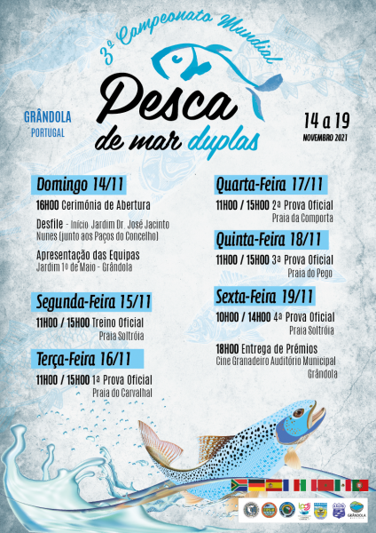 O Campeonato decorrerá de 14 a 19 de novembro, com a Cerimónia de abertura do Campeonato Mundial de Pesca de Mar Duplas a realizar-se no dia 14 de novembro, pelas 16h, em Grândola com dois momentos, primeiramente, o desfile de abertura no Jardim Dr. Jacinto Nunes, seguindo-se a apresentação das duplas no Jardim 1.º de Maio. No dia 15 de novembro, as equipas participam no Treino Oficial, para reconhecimento do terreno e das condições inerentes à realização da prova, na praia de Soltróia. O apuramento de equipas começa a 16 de novembro, com a realização da 1.ª Prova Oficial, de um total de 4 provas, na praia do Carvalhal.