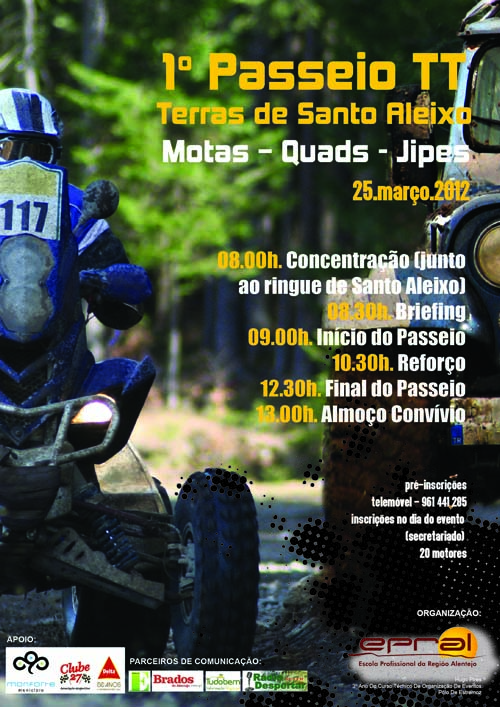 A organização do I Passeio TT Terras de Santo Aleixo corresponde à componente prática da Prova de Aptidão Profissional do formando Hugo Pires do Curso Técnico de Organização de Eventos do Pólo de Estremoz da Escola Profissional da Região Alentejo (EPRAL).