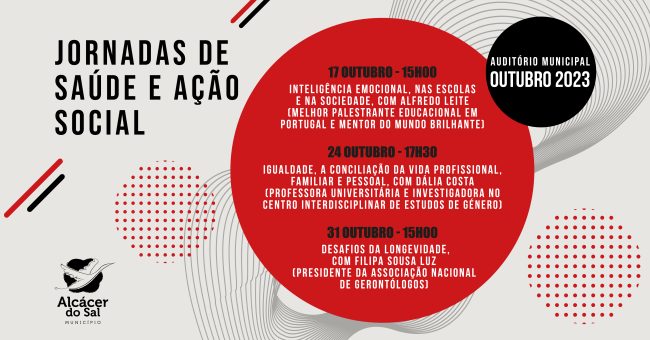 Recorde-se que as Jornadas de Saúde e Ação Social do Município de Alcácer do Sal seguem a metodologia das conferências express, em que cada orador convidado, de elevado reconhecimento académico e técnico, tem cerca de uma hora para abordar um tema, de forma dinâmica e interativa, e meia hora para o debater com o público presente. O primeiro ciclo de conferências ocorreu em maio deste ano.