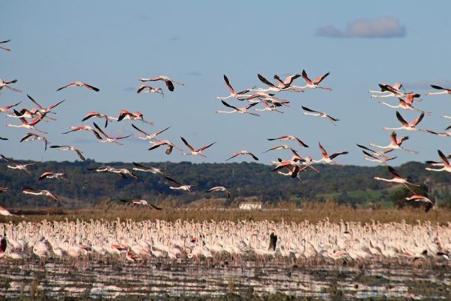 Todos os anos, milhares de flamingos passam pela Reserva Natural do Estuário do Sado em busca de alimento. Este mês de janeiro em particular, coincidindo com a preparação das terras para a sementeira do arroz, a zona da Ameira (perto da antiga estação de comboios de Alcácer do Sal) tem registado a presença de um elevado número destas aves pernaltas, proporcionando um espetáculo único natural em tons de rosa, branco e preto.