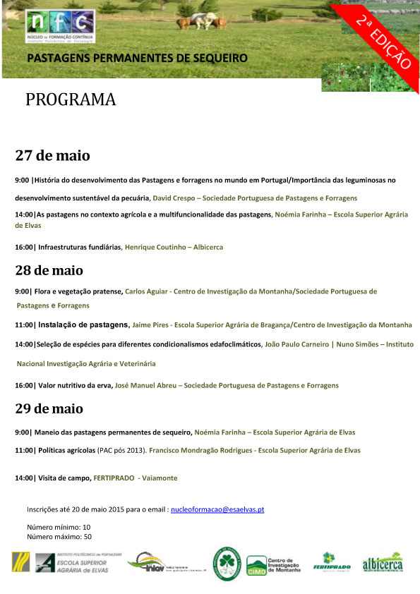 O NFC – Núcleo de Formação Contínua do Instituto Politécnico de Portalegre vai realizar nos dias 27, 28 e 29 de maio a 2ª edição do Curso de Pastagens Permanentes de Sequeiro.
