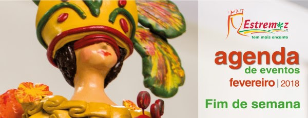 EXPOSIÇÕES – “MESTRE ROLO – TESOURO DA ARTE POPULAR DE ESTREMOZ”, trabalhos em vários materiais do artesão Joaquim Carriço, na Galeria D. Dinis (até 31 de março de 2018); – “EM ESTREMOZ… APAIXONE-SE!” trabalhos em tecido, bordados pelas alunas do atelier do Clube da Agulha da Academia Sénior de Estremoz, Posto de Turismo de Estremoz (até 11 de março de 2018); – “9 ARTISTAS/9 MUNIVIVÊNCIAS: ARTES VISUAIS DA TREMA”, pintura, fotografia e escultura de artistas representados por uma das mais prestigiadas galerias de arte de Lisboa, Palácio dos Marqueses da Praia e Monforte (até 15 de abril de 2018); – “20 OBRAS/20 ARTISTAS – COLEÇÃO DE DESENHO DO MUSEU MUNICIPAL DE ESTREMOZ, Museu Municipal de Estremoz (até 28 de abril de 2018).