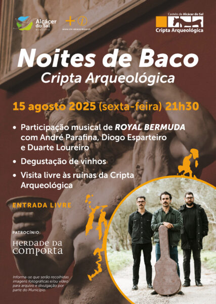 “Noites de Baco” é uma iniciativa que alia património, enologia e música num cenário único: a Cripta Arqueológica. O evento tem entrada gratuita e contempla visita livre à Cripta Arqueológica. É uma organização do Município de Alcácer do Sal e conta, nesta data, com o apoio da Herdade da Comporta.