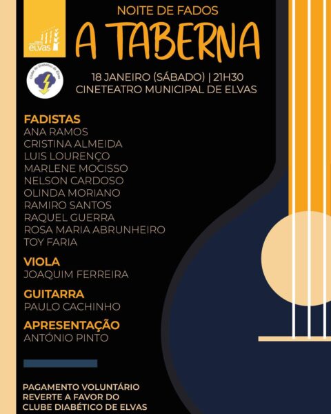 O Clube do Diabético de Elvas promove, com o apoio da Câmara Municipal de Elvas, uma Noite de Fados “A Taberna”, este sábado 18, pelas 21h30, no Cine-Teatro Municipal de Elvas.