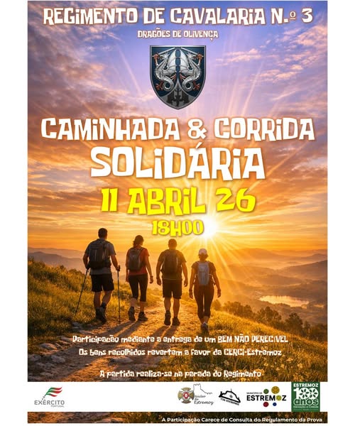 O Regimento de Cavalaria n.º 3 – Dragões de Olivença promove, no próximo , pelas , uma Caminhada & Corrida Solidária, com partida na parada do Regimento..
