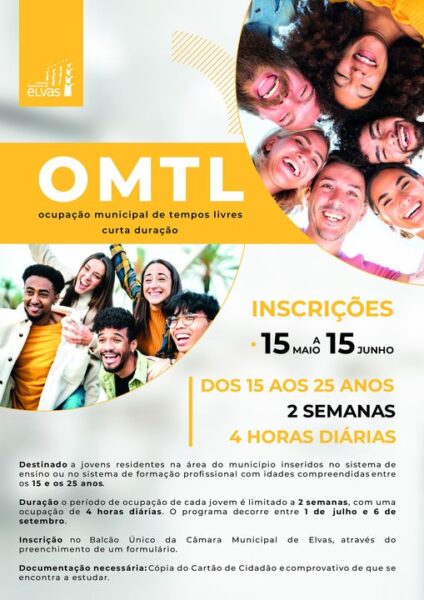 A Câmara Municipal de Elvas vai abrir inscrições para o programa de Ocupação Municipal de Tempos Livres (OMTL), entre 15 de maio e 15 de junho, para jovens residentes no concelho e com idades compreendidas entre os 15 e os 25 anos.