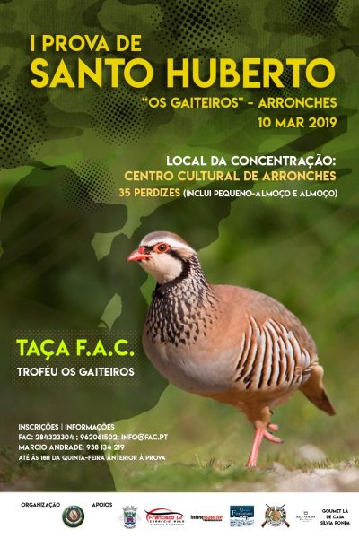 No seguimento das provas que se têm realizado em Arronches ao longo dos últimos anos e sabendo que este ano o circuito da Federação Portuguesa de Caça não irá passar pelo concelho, a Associação de Caçadores e Pescadores “Os Gaiteiros” de Arronches vai organizar a sua I Prova de Santo Huberto.