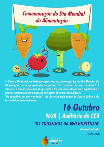 O Município de Redondo associa-se às comemorações do Dia Mundial da Alimentação com a apresentação do musical “Os conselhos da avó Hortênsia”. A brincar e a cantar todos iremos aprender a ter uma alimentação mais equilibrada e salutar, contribuindo para a adoção de hábitos alimentares saudáveis.