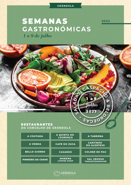 As semanas gastronómicas de verão apresentam, de 1 a 9 de julho, sugestões saudáveis, frescas e tradicionais da cozinha da região. Dos ingredientes ricos do gaspacho alentejano, acompanhado com peixe frito ou grelhado, a novas variações deste prato como o “gaspacho de melancia e tomate” às saladas frescas com opções variadas, à típica açorda de beldroegas, simples, com toucinho, com enchidos e entrecosto frito, ou com bacalhau e ovo, não deixe de provar os pratos que vão ser apresentados pelos doze restaurantes do concelho que participam nesta edição. Ao longo do ano as “Semanas Gastronómicas” promovidas pelo município de Grândola dão a conhecer e a saborear os produtos mais característicos de cada mês.