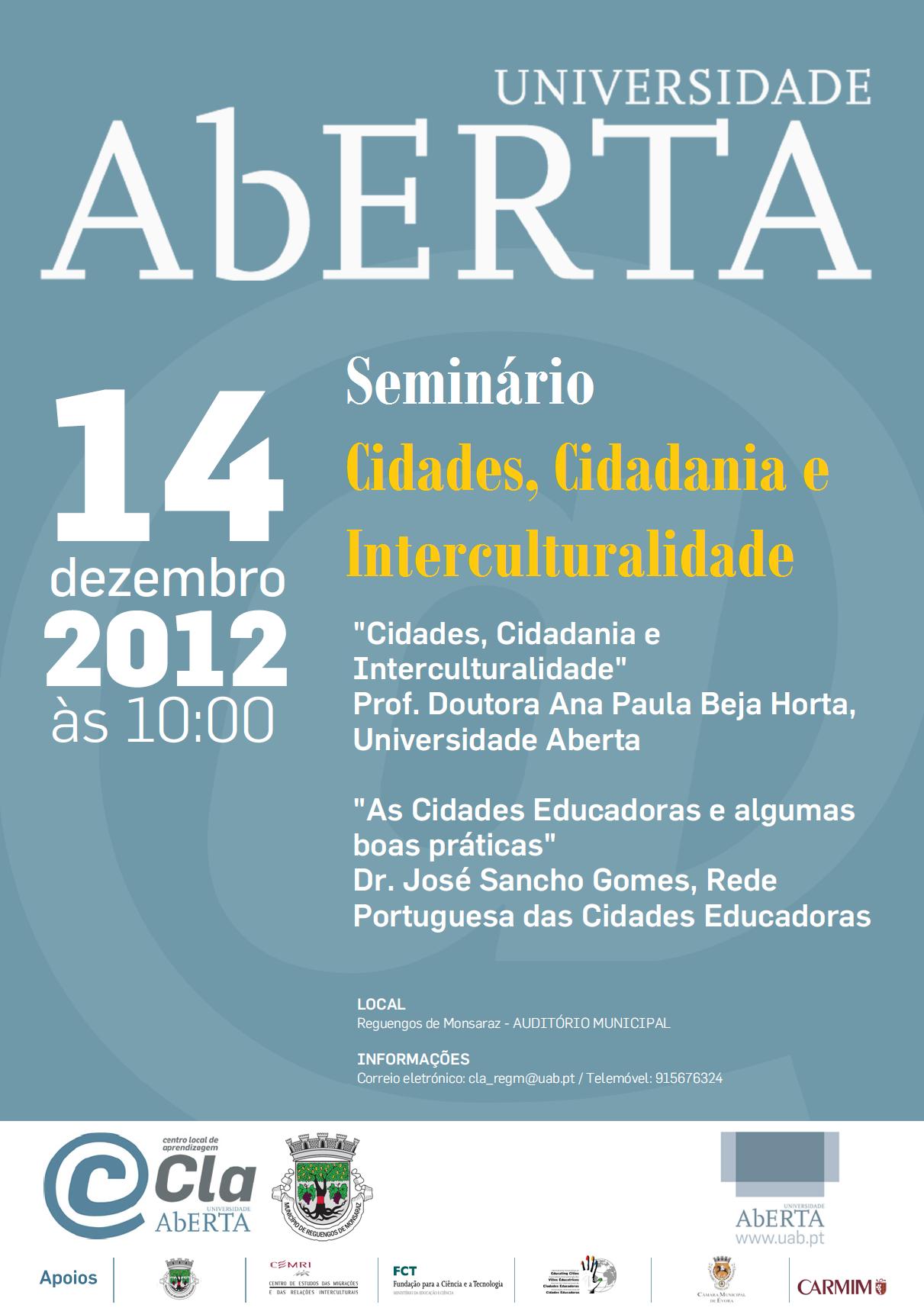 O Centro Local de Aprendizagem (CLA) da Universidade Aberta (UAb) em Reguengos de Monsaraz promove o “Seminário Cidades, Cidadania e Interculturalidade” em parceria com a Câmara Municipal de Reguengos de Monsaraz, a iniciativa tem lugar no AUDITÓRIO MUNICIPAL de Reguengos de Monsaraz, no dia 14 de dezembro de 2012, com início marcado para as 10h00 e duração aproximada de duas horas. No evento são apresentadas duas comunicações, uma relativa a “Cidades, Cidadania e Interculturalidade” proferida pela Prof. Doutora Ana Paula Beja Horta, docente da Universidade Aberta, e outra comunicação intitulada “Cidades Educadoras e algumas boas práticas” por parte do Dr. José Sancho Gomes, da Rede Portuguesa das Cidades Educadoras.