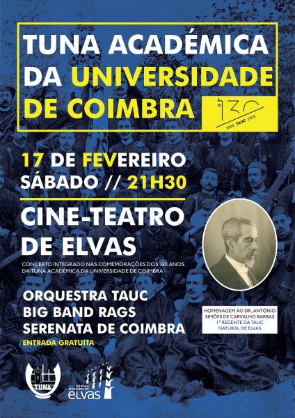 A Tuna Académica da Universidade de Coimbra (TAUC) vai estar em concerto este sábado, dia 17 de fevereiro, pelas nove e meia da noite, no Cine-Teatro Municipal de Elvas.