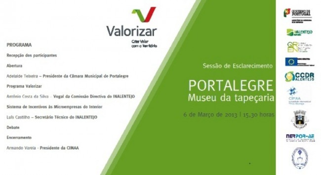 Programa da Sessão de Esclarecimento sobre o Programa Valorizar – Criar Valor com o Território, que irá ter lugar, no dia 6 de Março, pelas 15.30h no Museu da Tapeçaria em Portalegre.