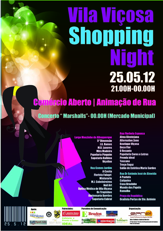 Neste evento, cujo um dos objetivos é fomentar o comércio local, as lojas aderentes vão ter descontos, promoções e muitas outras iniciativas a pensar “numa terapia de compras after hours”. A tudo isto alia-se ainda a animação de rua (mimos, malabarista, pinturas faciais, moldagem de balões, entre muitas outras atividades) a cargo do Grupo de Teatro Amador de Vila Viçosa, e mais alguns atores voluntários que vão desenvolver inúmeras atividades nas ruas Florbela Espanca, Largo Mouzinho de Albuquerque, Dr. António José de Almeida, Gomes Jardim e Praça da Republica. Este evento termina com a atuação da Banda Marshalls de Avis.