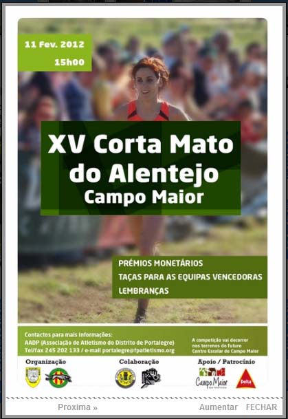 Realiza-se no próximo dia 11 de fevereiro, às 15:00 horas, o XV Corta-Mato do Alentejo em Campo Maior, um evento organizado conjuntamente pelo Sporting Clube Campomaiorense e pela Associação de Atletismo do Distrito de Portalegre (AADP).